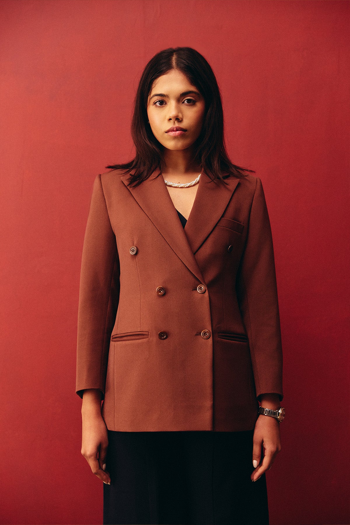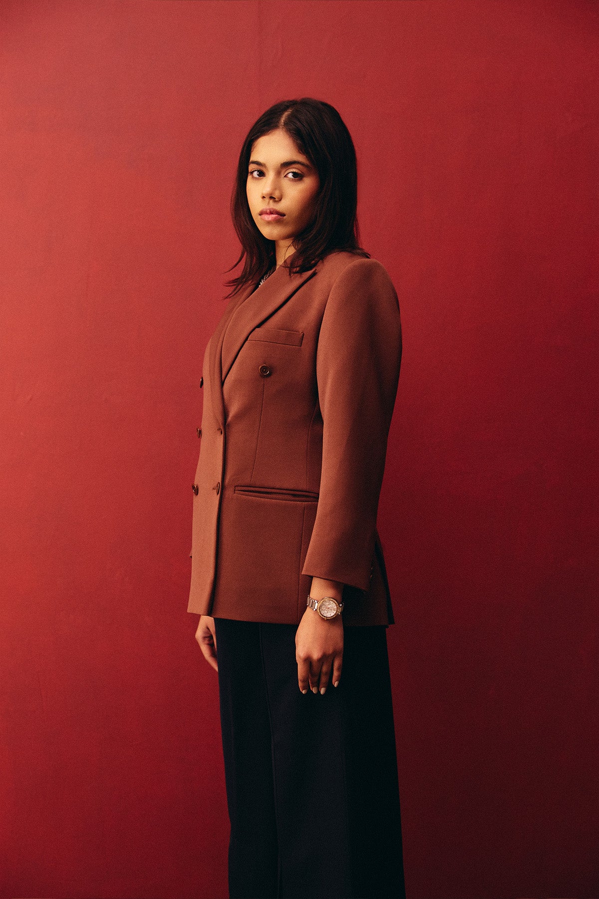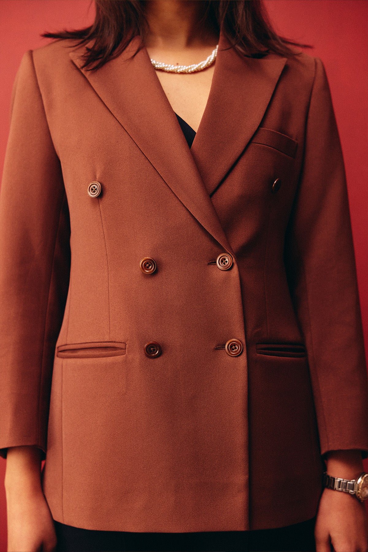 A commanding silhouette crafted with quiet authority — this brown double-breasted jacket is precision tailoring at its most powerful. Structured shoulders and a clean, sculpted fit create an unmistakably sharp profile, while the double-breasted closure lends depth and intention.