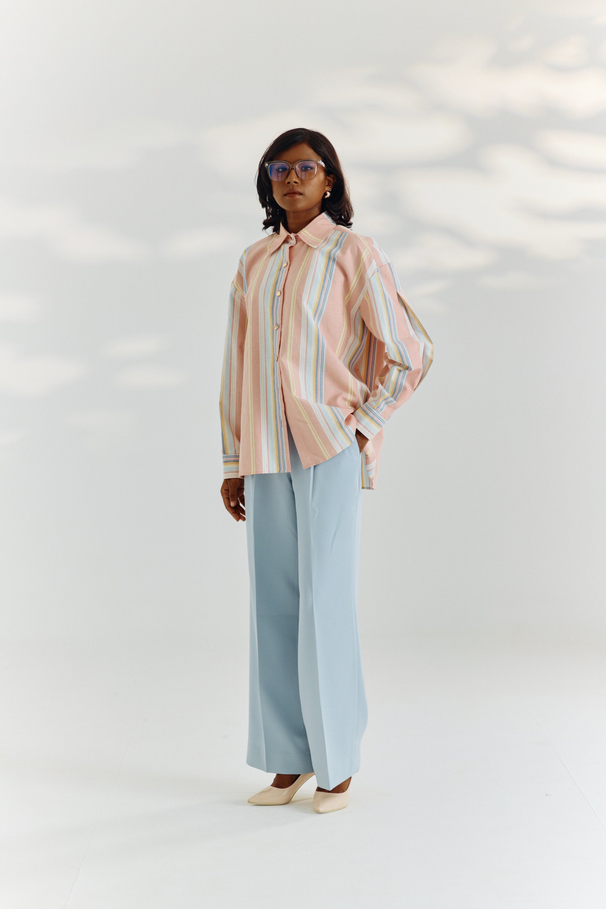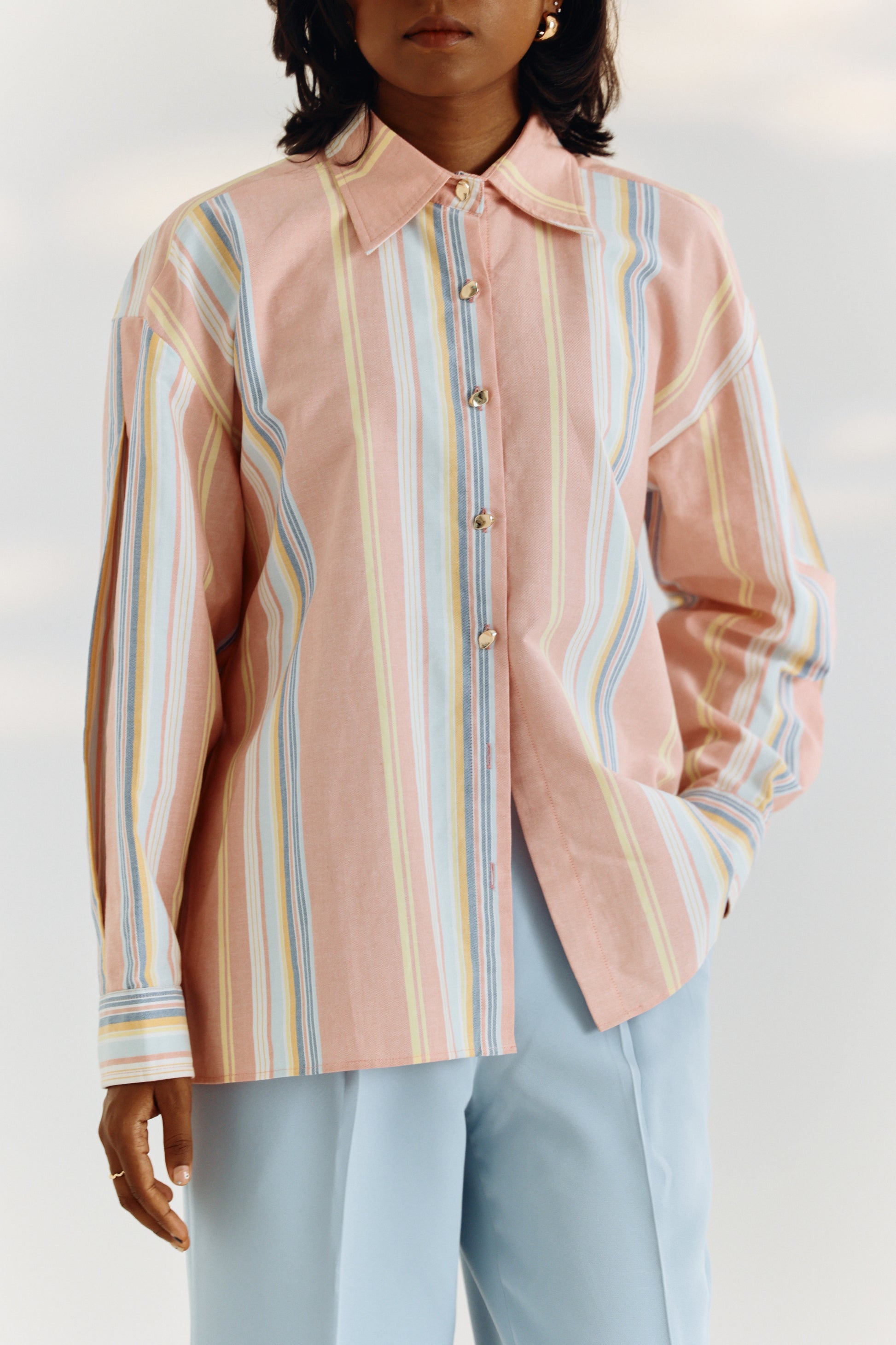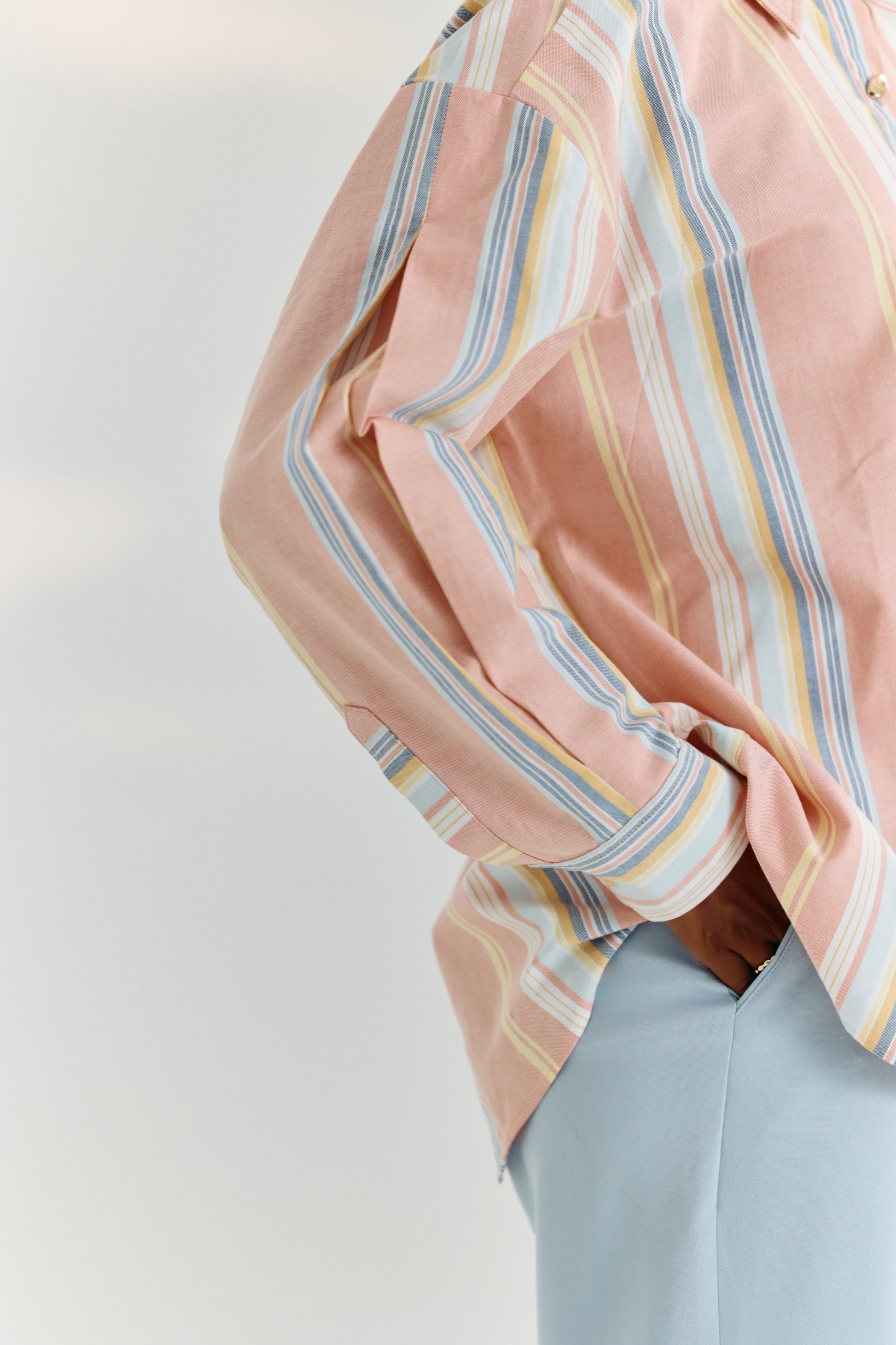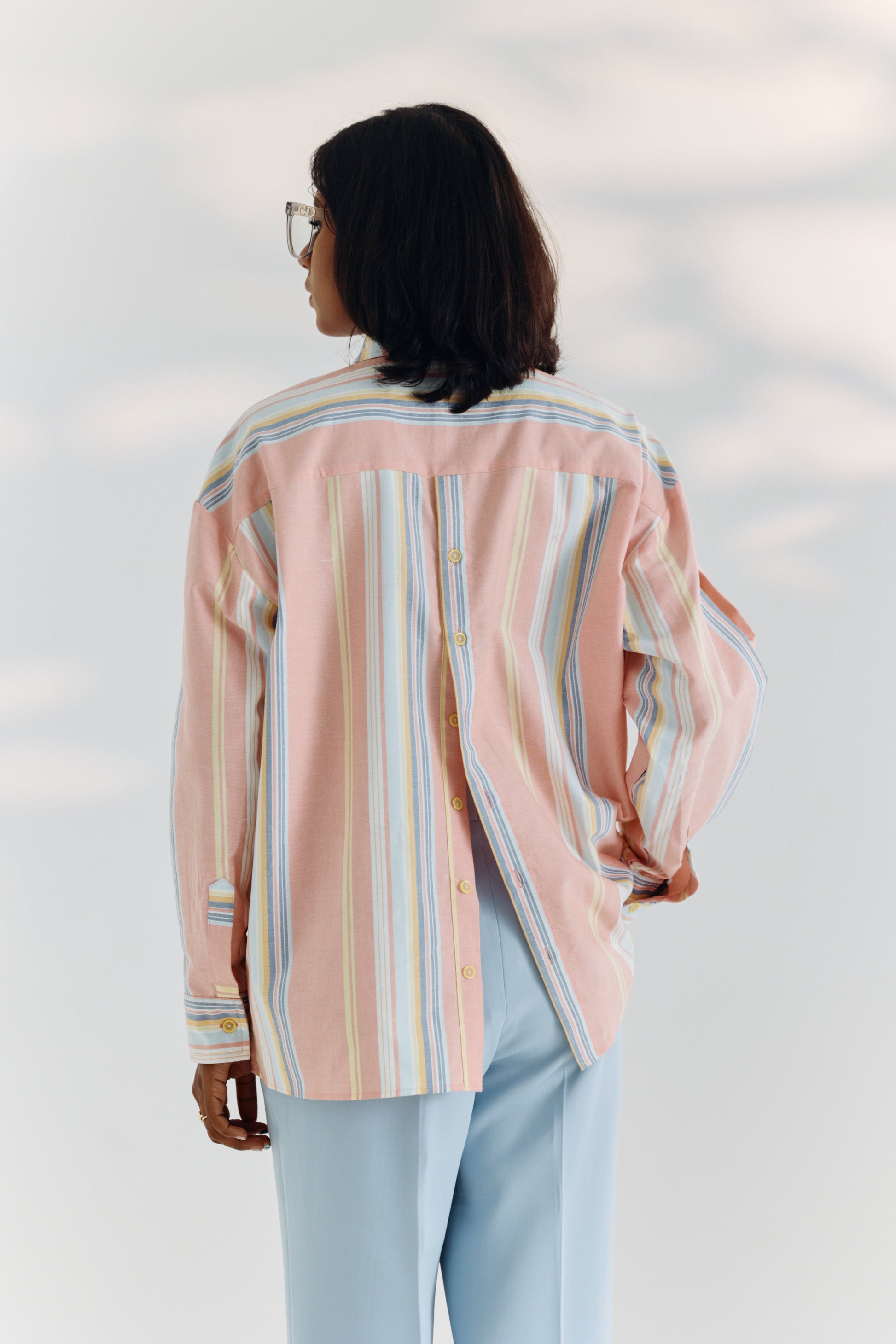 A refreshing take on corporate classics. This pink striped shirt is elevated with a back placket detail that adds unexpected structure and polish. Voluminous pleated sleeves lend sculptural elegance while maintaining an effortless silhouette. A piece that balances femininity with quiet authority.