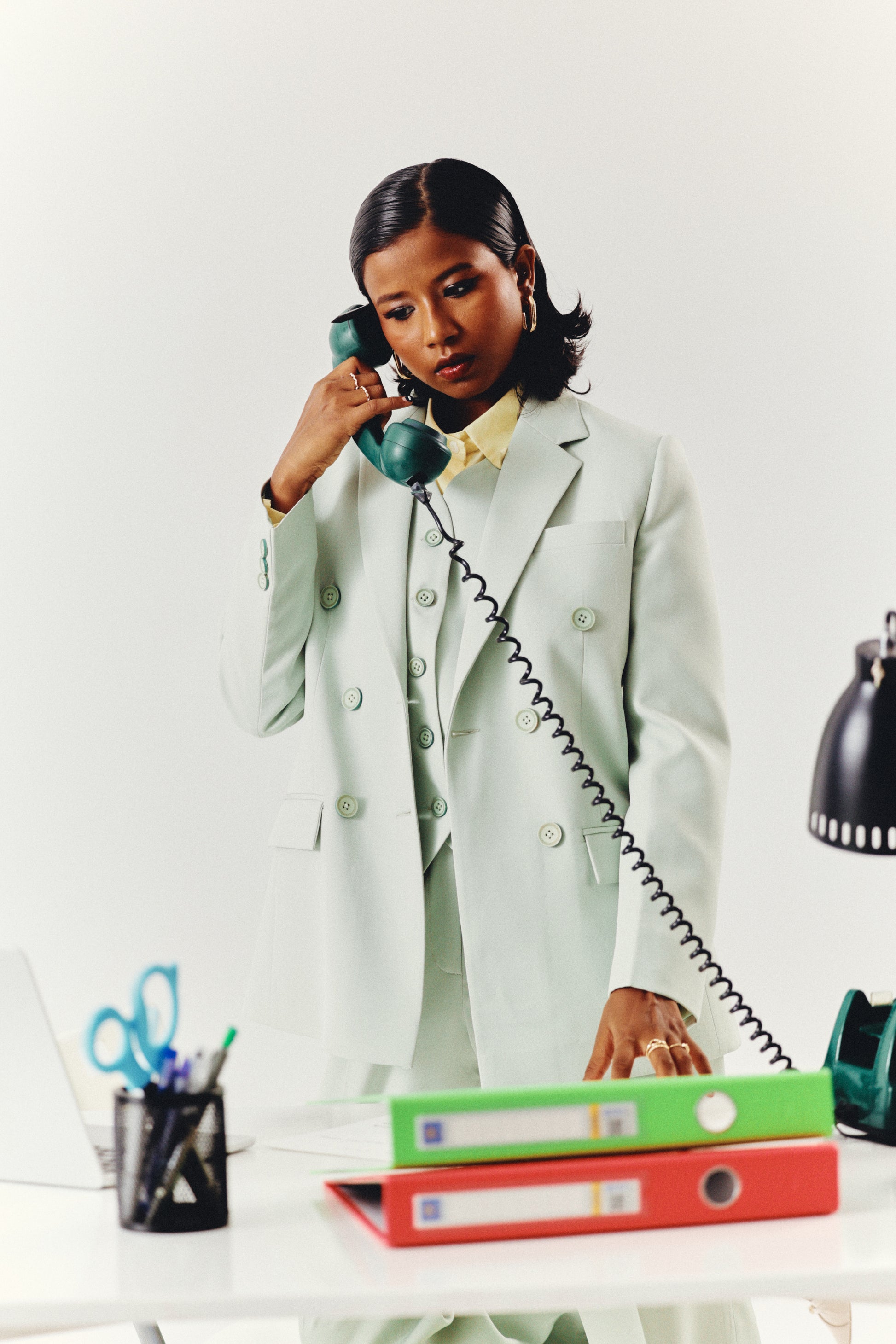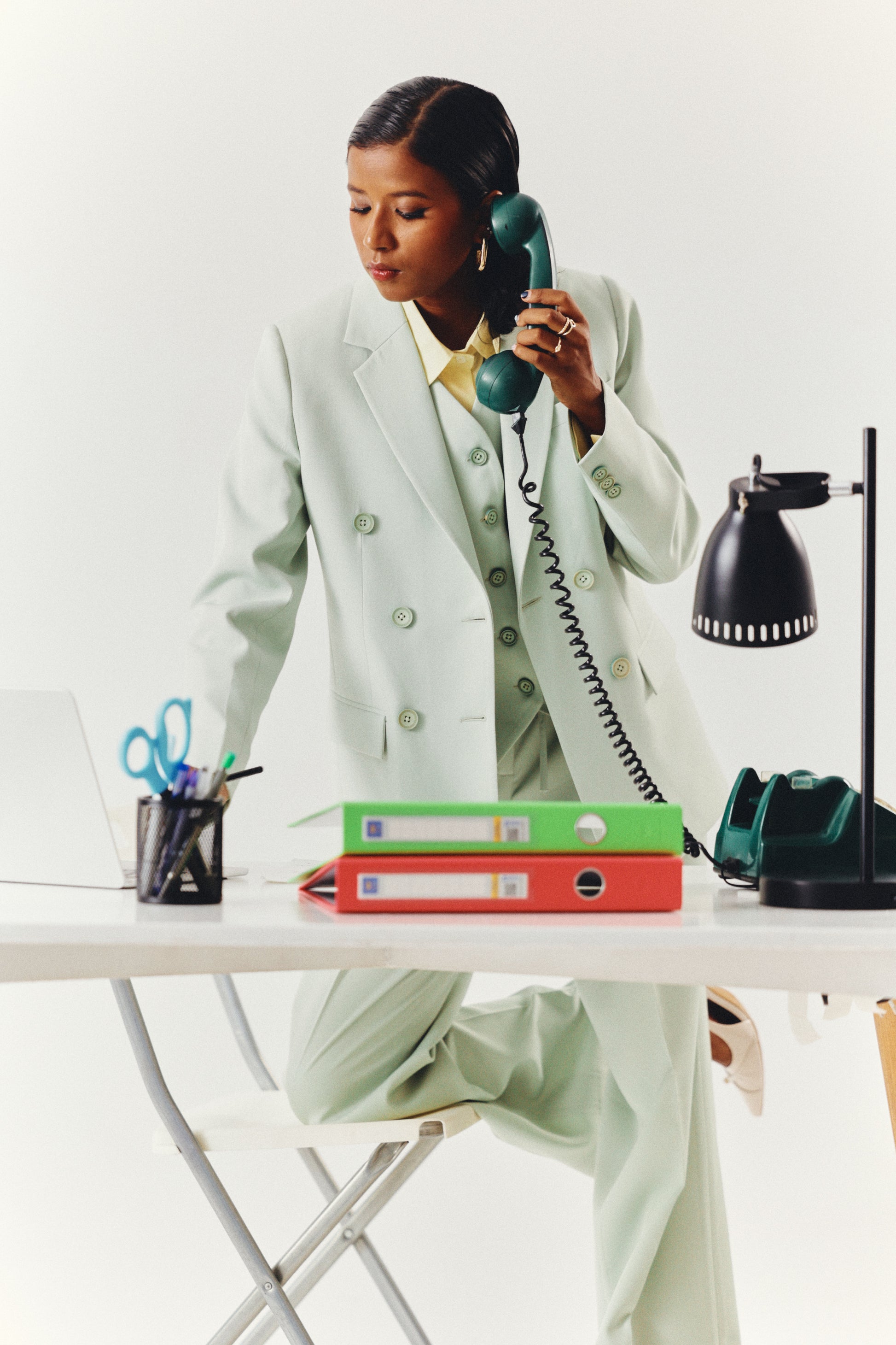 A balance of strength and softness. This sage green double-breasted jacket features a boxy fit and sharp silhouette—tailored to command attention while embracing ease. The light, summery tone brings a sense of calm authority, making it a versatile piece that layers effortlessly over varied looks. It's power dressing, reimagined with grace.