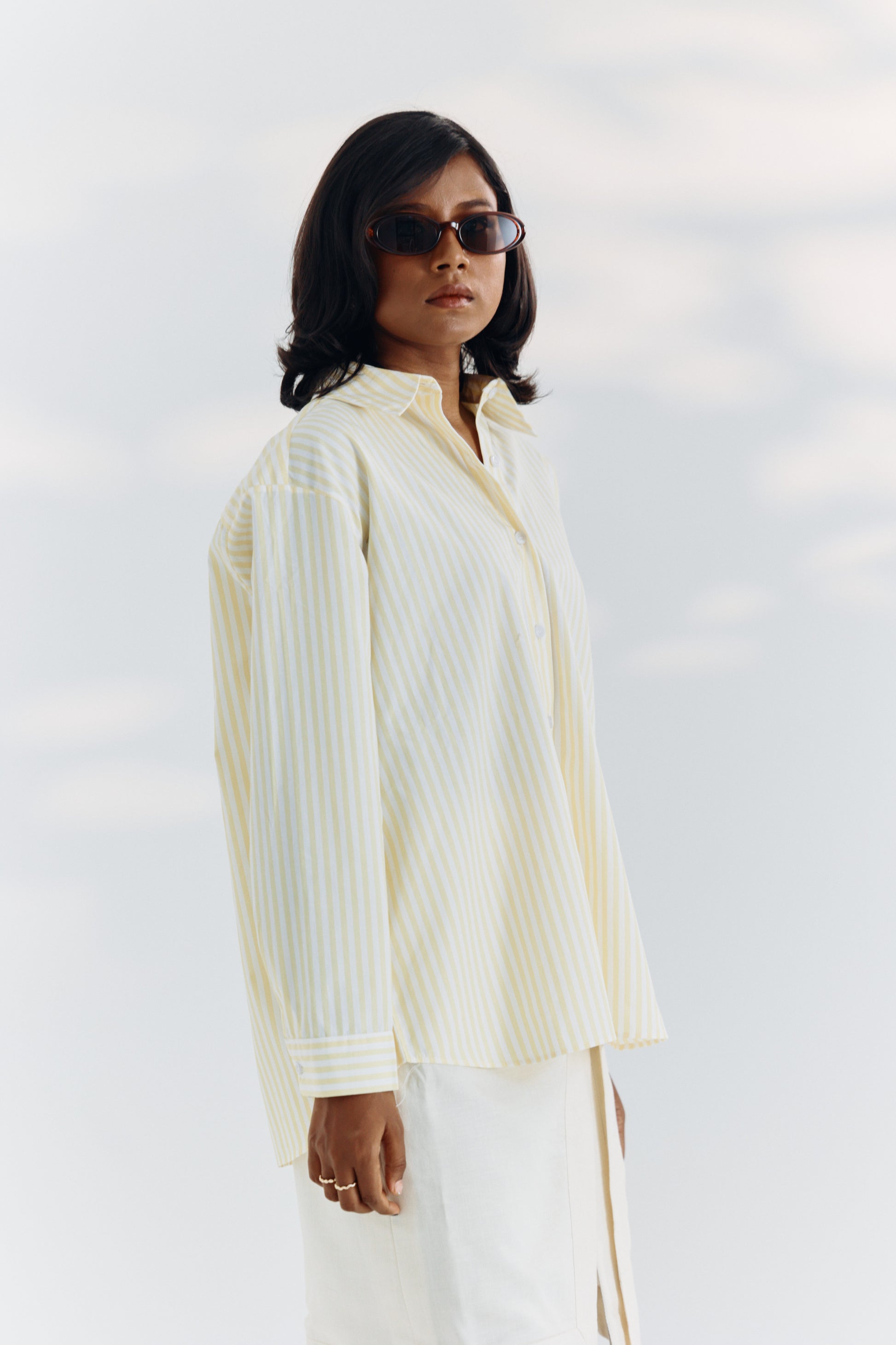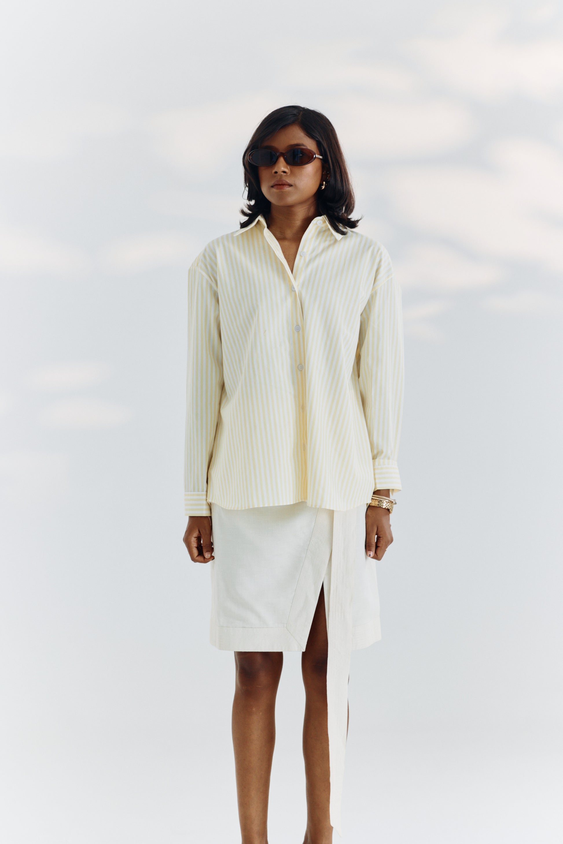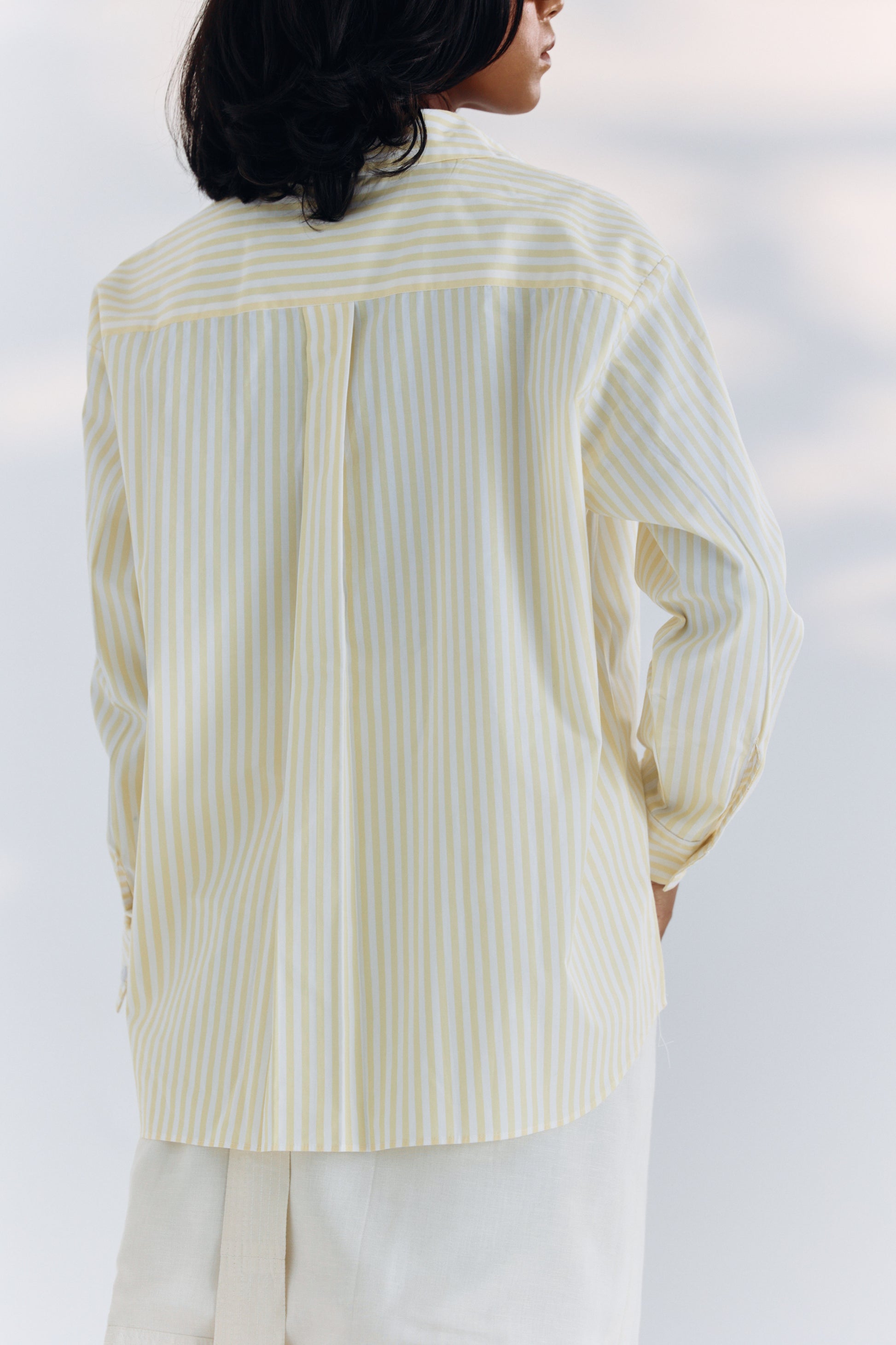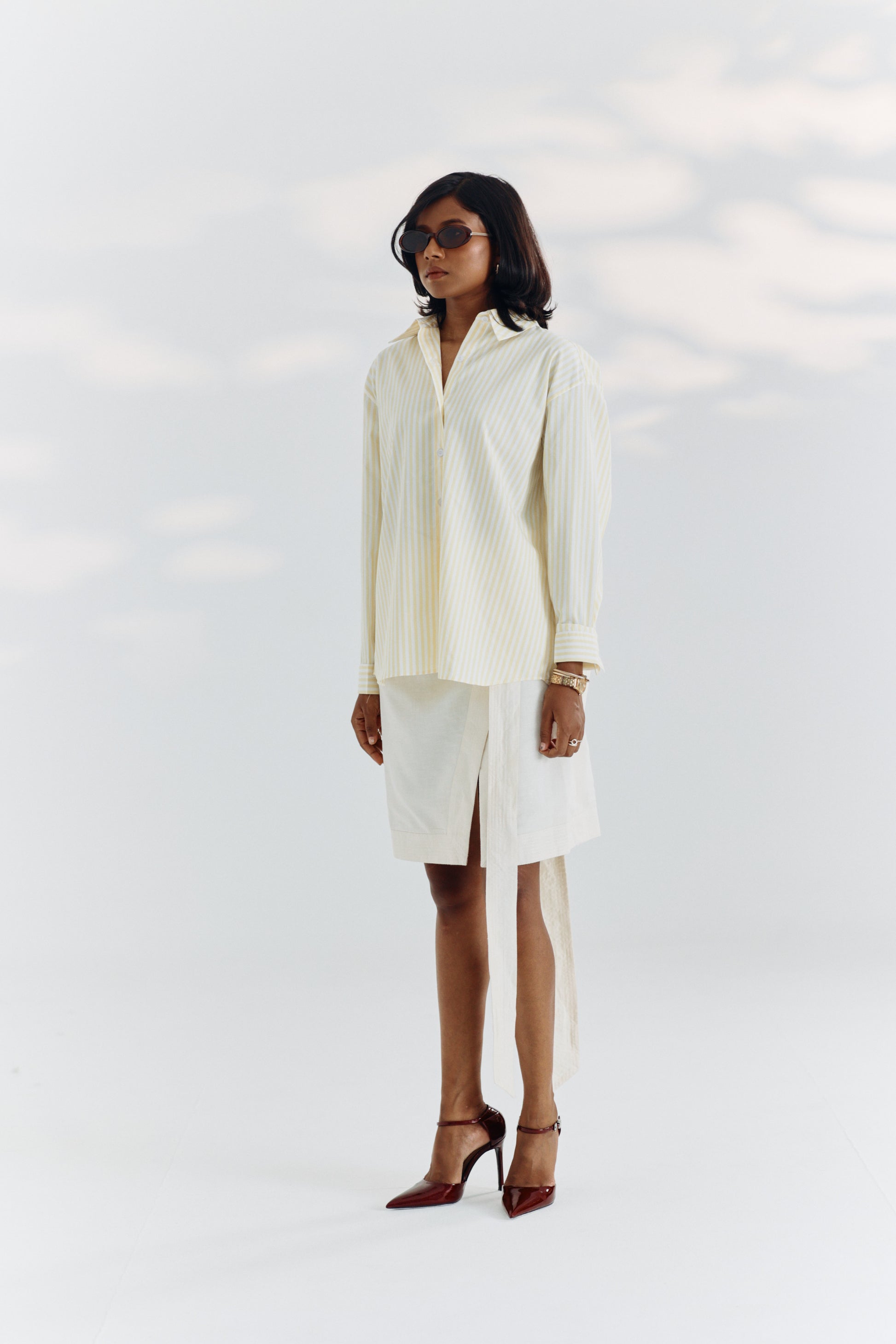 A classic with a twist. This striped shirt is cut in a boxy silhouette from breathable cotton, offering effortless structure and ease. The back pleat adds volume and movement, making it equal parts functional and fresh. Designed to take you seamlessly from office hours to happy hours—this one’s built for long days and even better evenings.