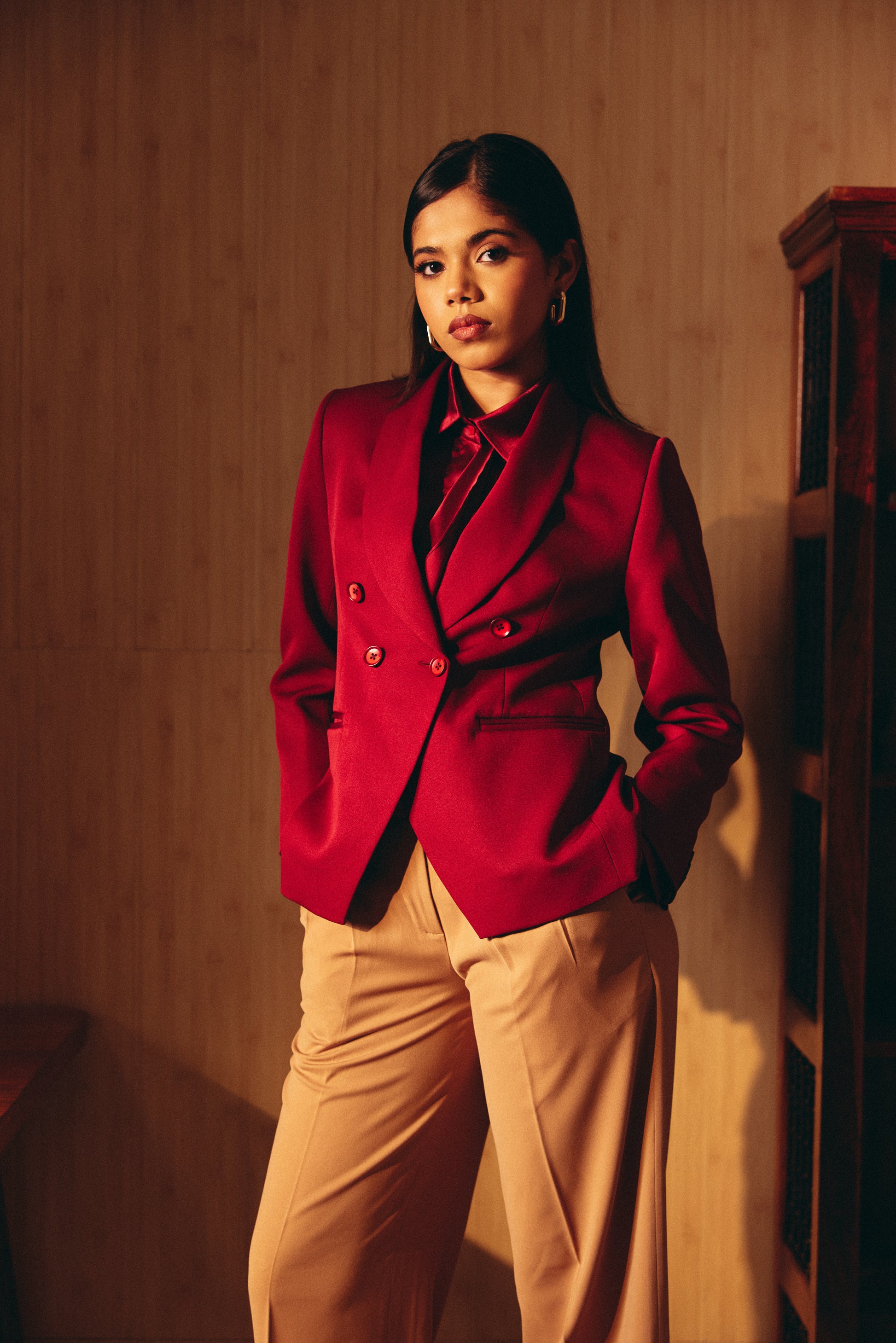 A fitted jacket in a rich burgundy hue, defined by a sculpted shawl collar and clean, intentional lines. Crafted to sit perfectly on the body, it delivers a sharp yet fluid silhouette, refined by the soft drape of banana crepe. A statement in precision, designed to command without excess.