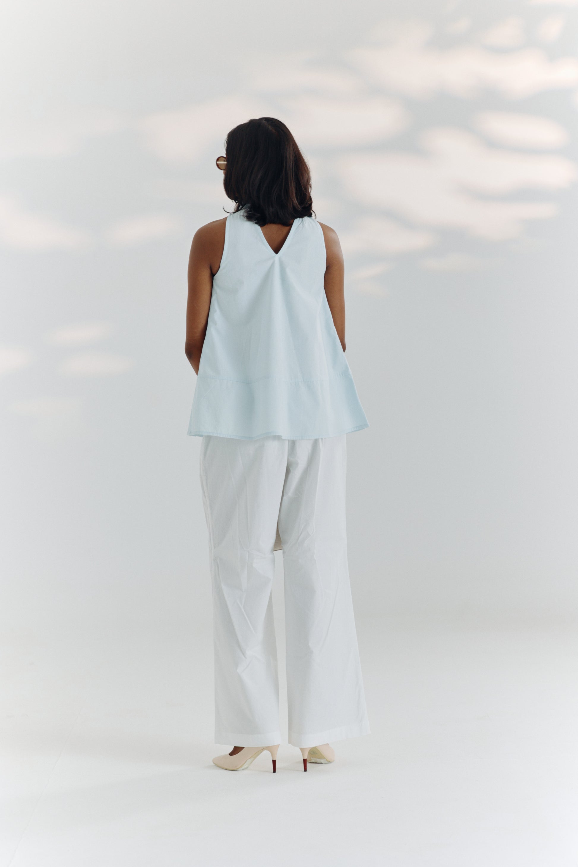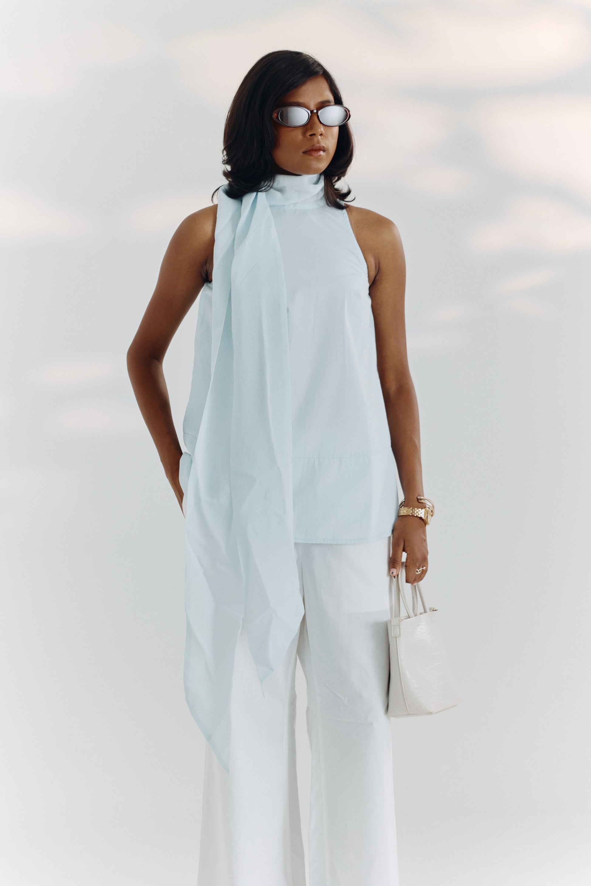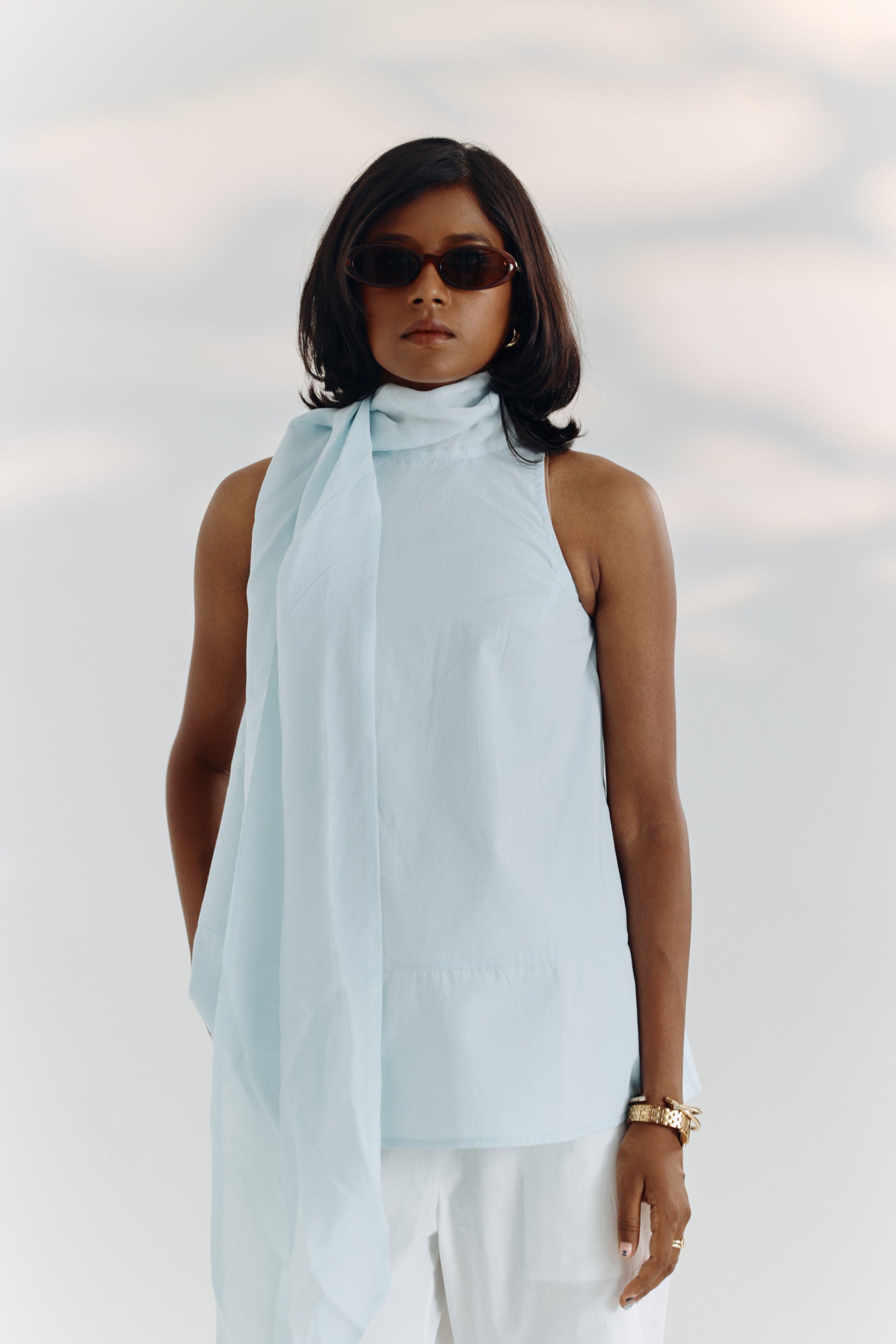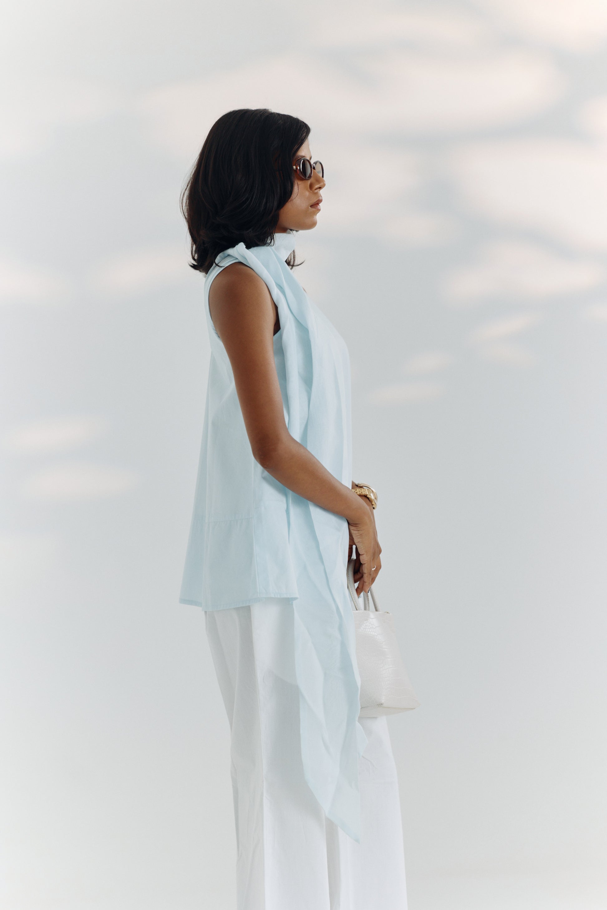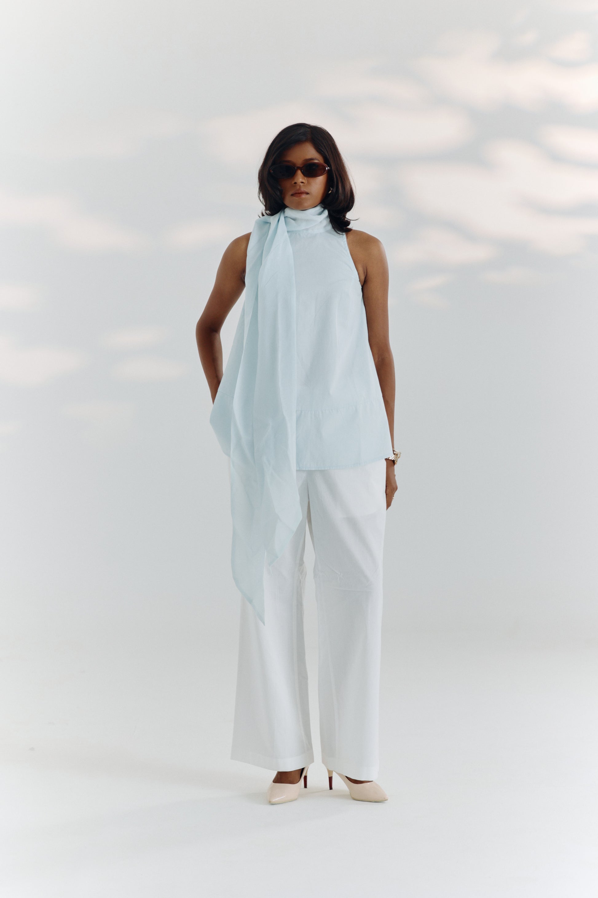 Elegant in form and fluid in function, this A-line top is designed for graceful movement and ease. Cut in a soft blue tone, it features an attached organza neck scarf that adds a layer of soft sophistication. The silhouette flatters without fuss, making it an ideal piece for transitioning seamlessly from desk to dinner.