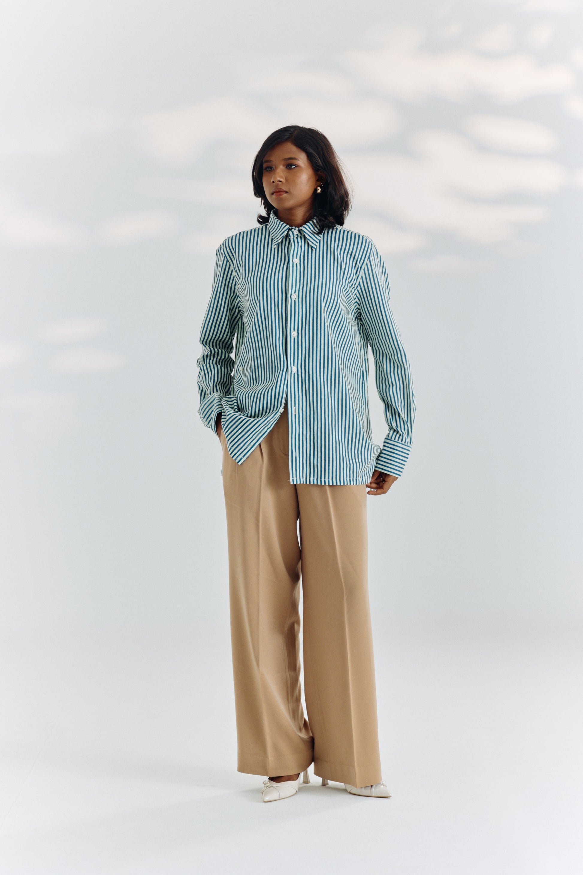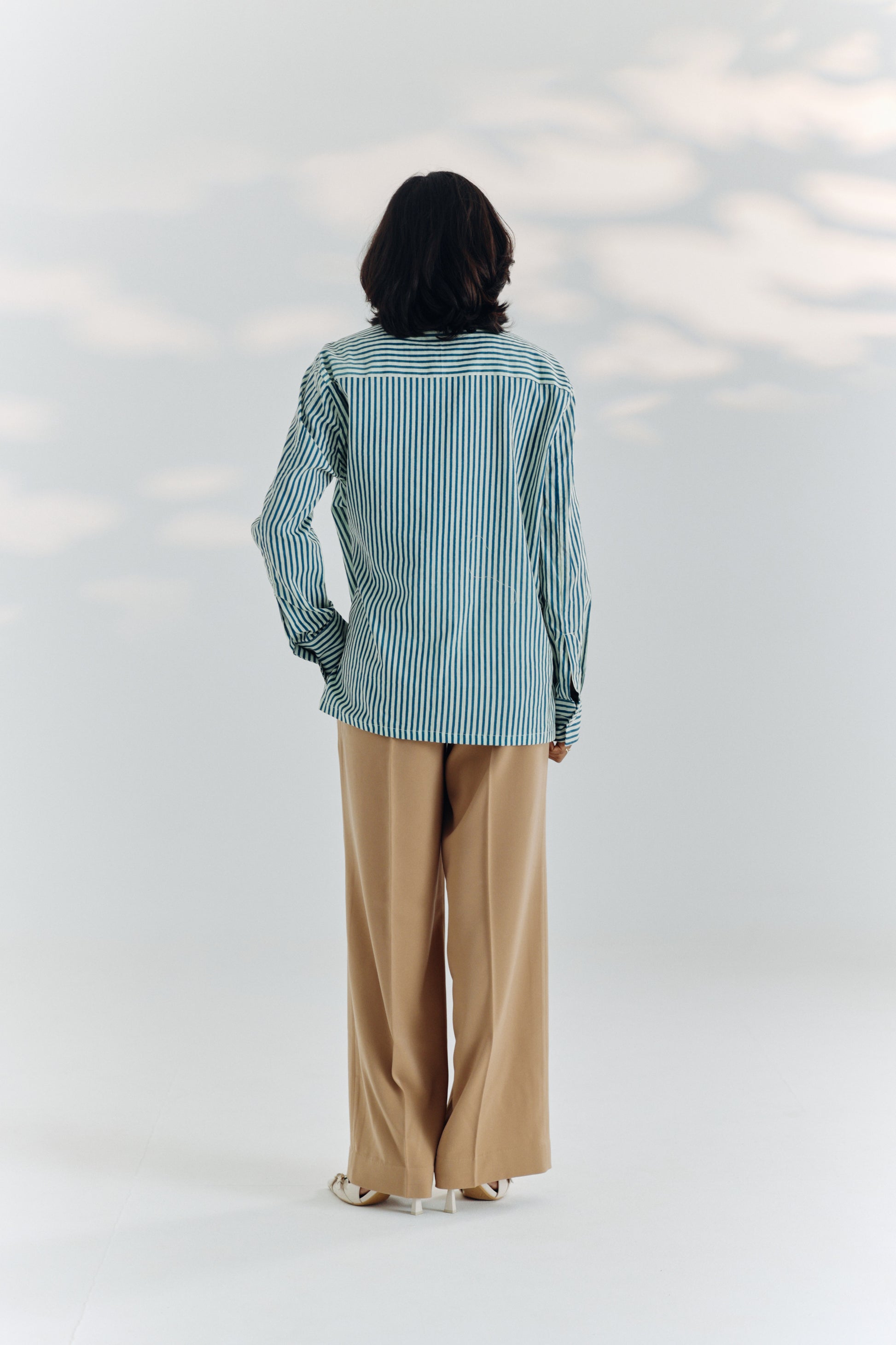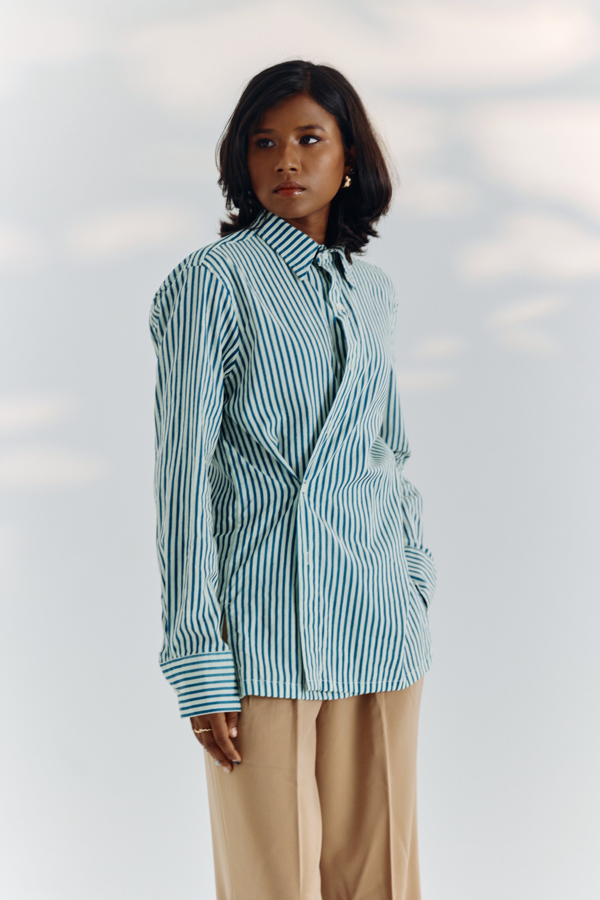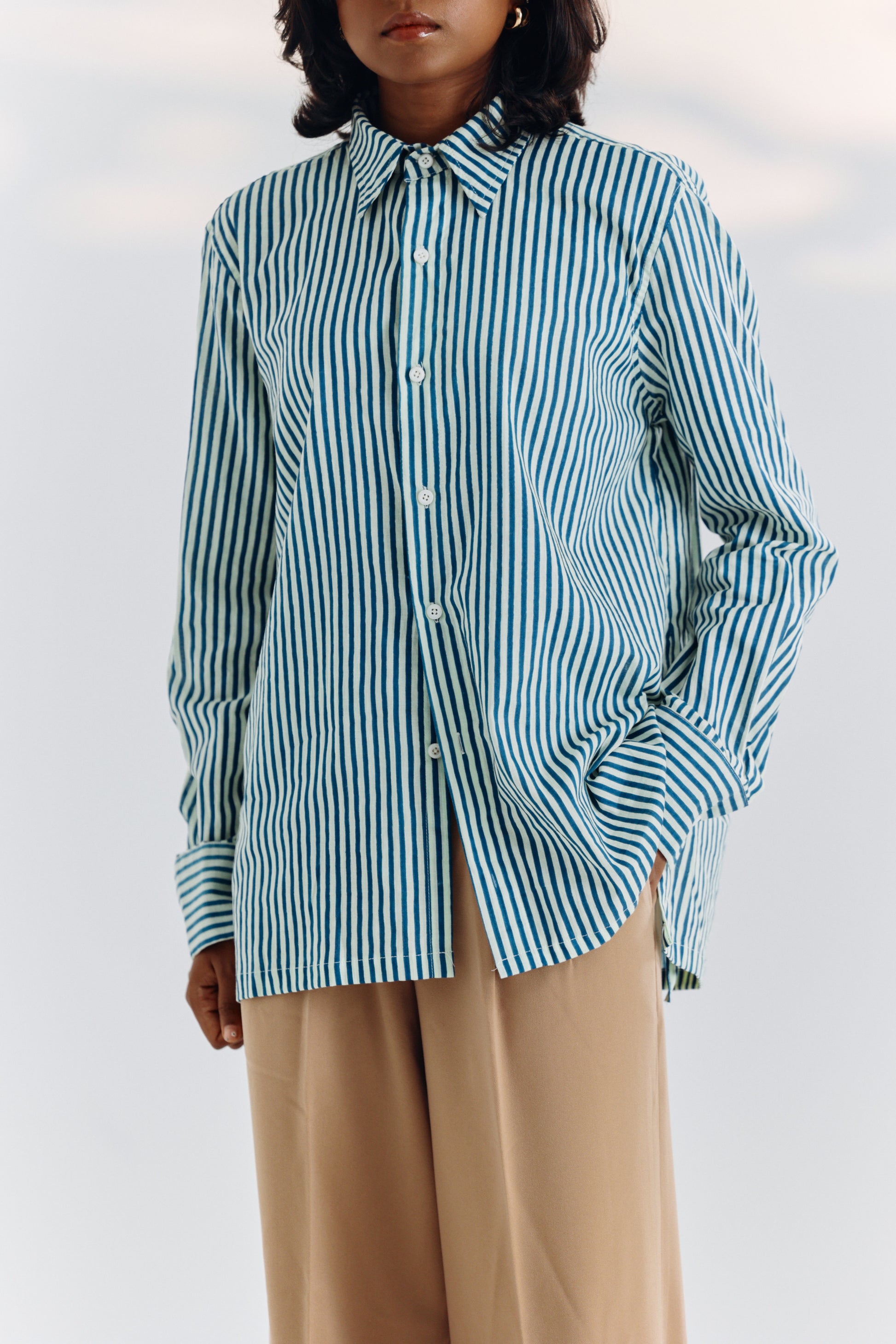 A twist on the timeless. This blue and white striped cotton shirt features a classic cut elevated by an unexpected asymmetrical button placket—bringing just the right amount of edge to a wardrobe staple. It’s crisp, effortless, and built to move from boardroom polish to off-duty ease in seconds.